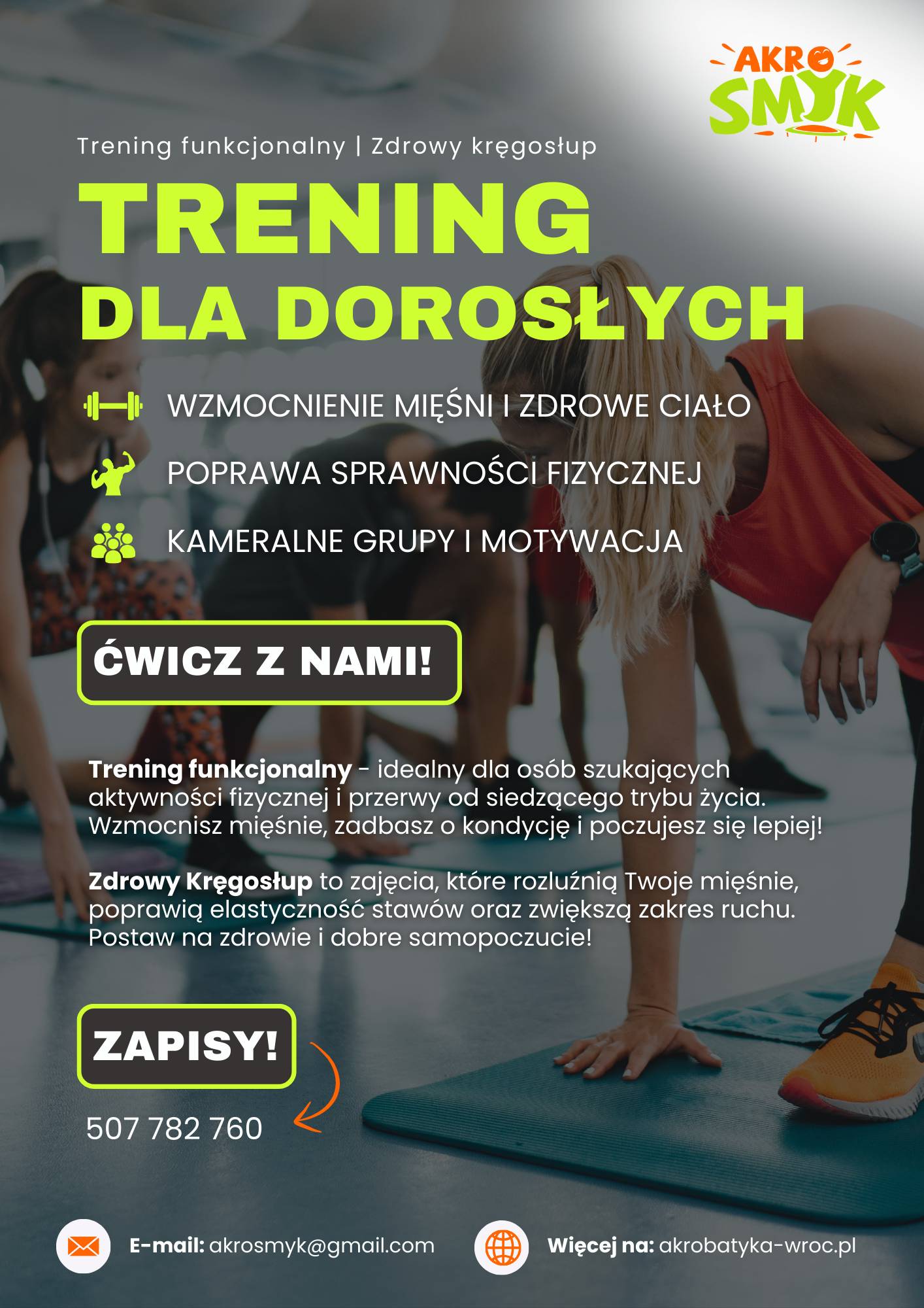 Zapraszamy na Zdrowy kręgosłup oraz Trening funkcjonalny całego ciała – wybierz te zajęcia, które najlepiej odpowiadają Twoim potrzebom, a oba stworzą idealne połączenie dla Twojego ciała! Prowadzimy je w kameralnych grupach, dzięki czemu każdy uczestnik może liczyć na indywidualne wsparcie i motywację.